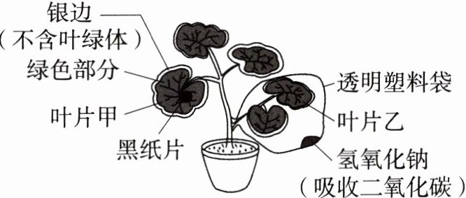 9.(2024 山东滨州中考,5,★☆☆)将在黑暗处放置一昼夜的银边天竺葵进行如图处理后,移到光下照射3 小时左右,摘下叶片甲和乙,经脱色、漂洗后滴加碘液,观察实验现象。该实验不能验证( )