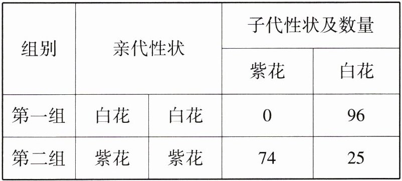 (1)豌豆花的紫色和白色在遗传学上称为一对_______性状,是由_______控制的。第一组中亲代是白花,子代也是白花的现象叫_______。