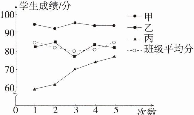 6. (2024山东滨州邹平一模)如图所示的是某班甲、乙、丙三位同学最近5次数学成绩及班级相应平均分的折线统计图,则下列判断错误的是( )