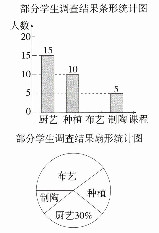 ∴调查的学生中最喜欢“布艺”的人数为50 - 15 - 10 - 5 = 20.
