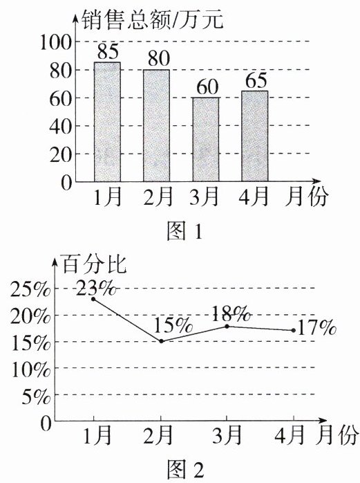 10. (2023福建福州台江模拟)某商场2021年1—4月的销售总额如图1,其中A商品的销售额占当月销售总额的百分比如图2.