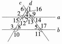 内错角有∠1 与∠4,∠1 与∠5,∠7 与∠13,∠12 与∠4,∠6 与∠7,∠6 与∠8,∠16 与∠2,∠16 与∠9,∠15 与∠8,∠12 与∠3,∠14 与∠5,∠13 与∠17,∠11 与∠8,∠10 与∠5,∠16 与∠17,∠16 与∠3,共有 16 对. 故选 D.