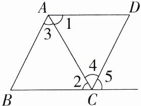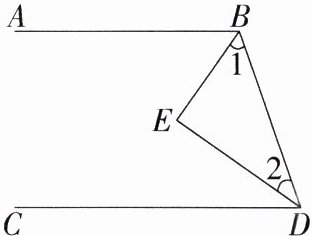 解析:因为 BE 平分∠ABD,DE 平分∠BDC,所以∠ABD = 2∠1,∠BDC = 2∠2,因为∠1 + ∠2 = 90°,所以∠ABD + ∠BDC = 2(∠1 + ∠2) = 180°,所以 AB//CD(同旁内角互补,两直线平行)。