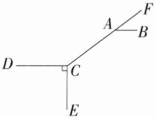 解析:【解法一】AB//DC。理由如下:因为∠BAF = 38°,∠BAF + ∠CAB = 180°,所以∠CAB = 142°。因为 DC⊥CE,所以∠DCE = 90°。又因为∠DCE + ∠ACE + ∠DCA = 360°,∠ACE = 128°,所以∠DCA = 142°。所以∠DCA = ∠CAB,所以 AB//DC(内错角相等,两直线平行)。【解法二】辅助线法:AB//DC。理由如下:如图所示,反向延长射线 CD 到点 G。因为 DC⊥CE,所以∠ECG = 90°,因为∠ACG + ∠ECG = ∠ACE = 128°,所以∠ACG = 38°。所以∠BAF = ∠ACG,所以 AB//DC(同位角相等,两直线平行)。
