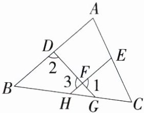 14.(2024陕西西安新城月考,20,★★☆)如图,三角形ABC中,D、E分别为边AB、AC上的点,H、G为边BC上两点,连接EH、DG,DG与EH交于点F,已知∠1 + ∠2 = 180°,试说明:AB//EH. (M7208004)