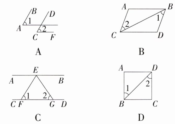 D:A.由∠1 = ∠2,不能得到 AB//CD;B.因为∠1 = ∠2,所以 AC//BD,不能得到 AB//CD;C.由∠1 = ∠2,不能得到 AB//CD;D.因为∠1 = ∠2,所以 AB//CD,符合题意。