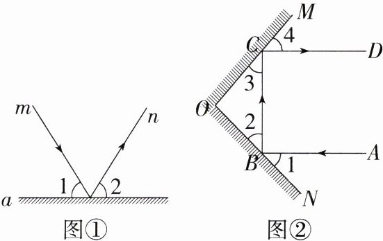 14.跨物理·光的反射 (2023山东菏泽成武三模,13,★★☆)平面镜在光学仪器中有广泛的应用.平面镜反射光线的规律是射到平面镜上的光线和被反射出的光线与平面镜所夹的锐角相等.如图①,一束光线m射到平面镜a上,被a反射后的光线为n,则∠1 = ∠2.如图②,两平面镜OM,ON的夹角为∠MON,若任何射到平面镜ON上的入射光线AB,经过平面镜ON,OM两次反射后,射出的光线为CD,且AB//CD,则∠MON = __________°.(M7208005)
