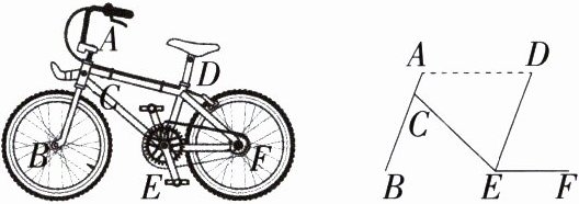 13.情境题·现实生活 (2024山东泰安宁阳二模,3,★☆☆)随着科技发展,骑行共享单车这种“低碳”生活方式已融入人们的日常生活,如图所示的是共享单车车架的示意图,线段AB,CE,DE分别为前叉、下管和立管(点C在AB上),EF为后下叉.已知AB//DE,AD//EF,∠BCE = 67°,∠CEF = 137°,则∠ADE的度数为( )