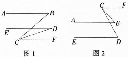 (2)改变了. 新的等量关系为 ∠BCD = ∠D - ∠B. 理由:如图 2,过点 C 作 CF//AB,