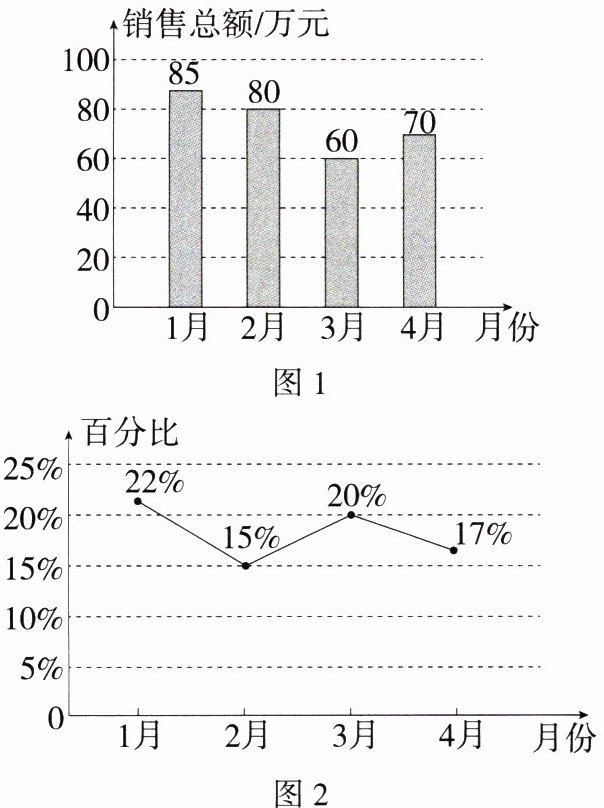 8.(2024山东淄博周村期末)某电商网站以智能手表为主要的产品运营.今年1—4月份,该网站智能手表的销售总额如图1所示,其中一款通话功能智能手表的销售额占当月智能手表销售总额的百分比如图2所示.