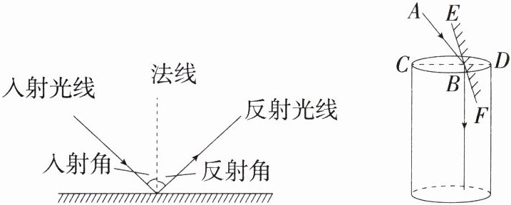 15.跨物理·光的反射(2024河南郑州经开区外国语学校模拟)汉代初期的《淮南万毕术》是中国古代有关物理、化学的重要文献,书中记载了我国古代学者在科学领域做过的一些探索及成就.其中所记载的“取大镜高悬,置水盆于其下,则见四邻矣”,是古人利用光的反射定律改变光路的方法,即“反射光线与入射光线、法线在同一平面上;反射光线和入射光线位于法线的两侧;反射角等于入射角”.为了探清一口深井的底部情况,运用此原理,在井口放置一面平面镜可改变光路,如图,当太阳光线AB与地面CD所成夹角∠ABC = 50°时,要使太阳光线经反射后刚好垂直于地面射入深井底部,则需使平面镜EF与地面的夹角∠EBC = ________.
