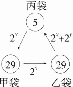 16.运算能力(2024山东淄博博山一模)如图,在甲、乙、丙三只袋中分别装有球29个、29个、5个,先从甲袋中取出$2^{x}$个球放入乙袋,再从乙袋中取出$(2^{x}+2^{y})$个球放入丙袋,最后从丙袋中取出$2^{y}$个球放入甲袋,此时三只袋中球的个数相同,则$2^{x + y}$的值为( )