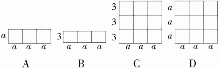 D:A 表示的面积是$3a\times a = 3a^{2}$;B 表示的面积是$3\times3a = 9a$;C 表示的面积是$3\times3a\times3 = 27a$;D 表示的面积是$(3a)^{2}=9a^{2}$。故选 D。