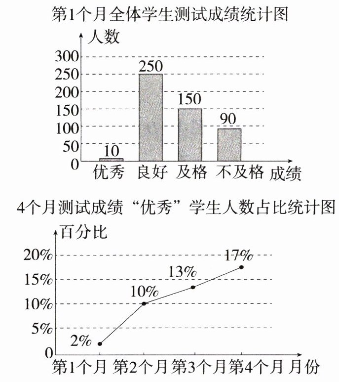 由折线统计图可知,从第1个月到第4个月,测试成绩为“优秀”的学生人数在总人数中的占比逐月增长,故②正确;