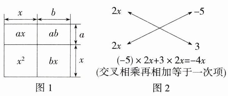 如图 1 所示,已知$a$,$b$为常数,由面积相等可得$(x + a)(x + b)=x^{2}+ax + bx + ab=x^{2}+(a + b)x + ab$,将该式从右到左使用,就可以对形如$x^{2}+(a + b)x + ab$的多项式进行因式分解,即$x^{2}+(a + b)x + ab=(x + a)(x + b)$.观察发现多项式$x^{2}+(a + b)x + ab$的特征是二次项系数为 1,常数项为两数之积,一次项系数为这两数之和.