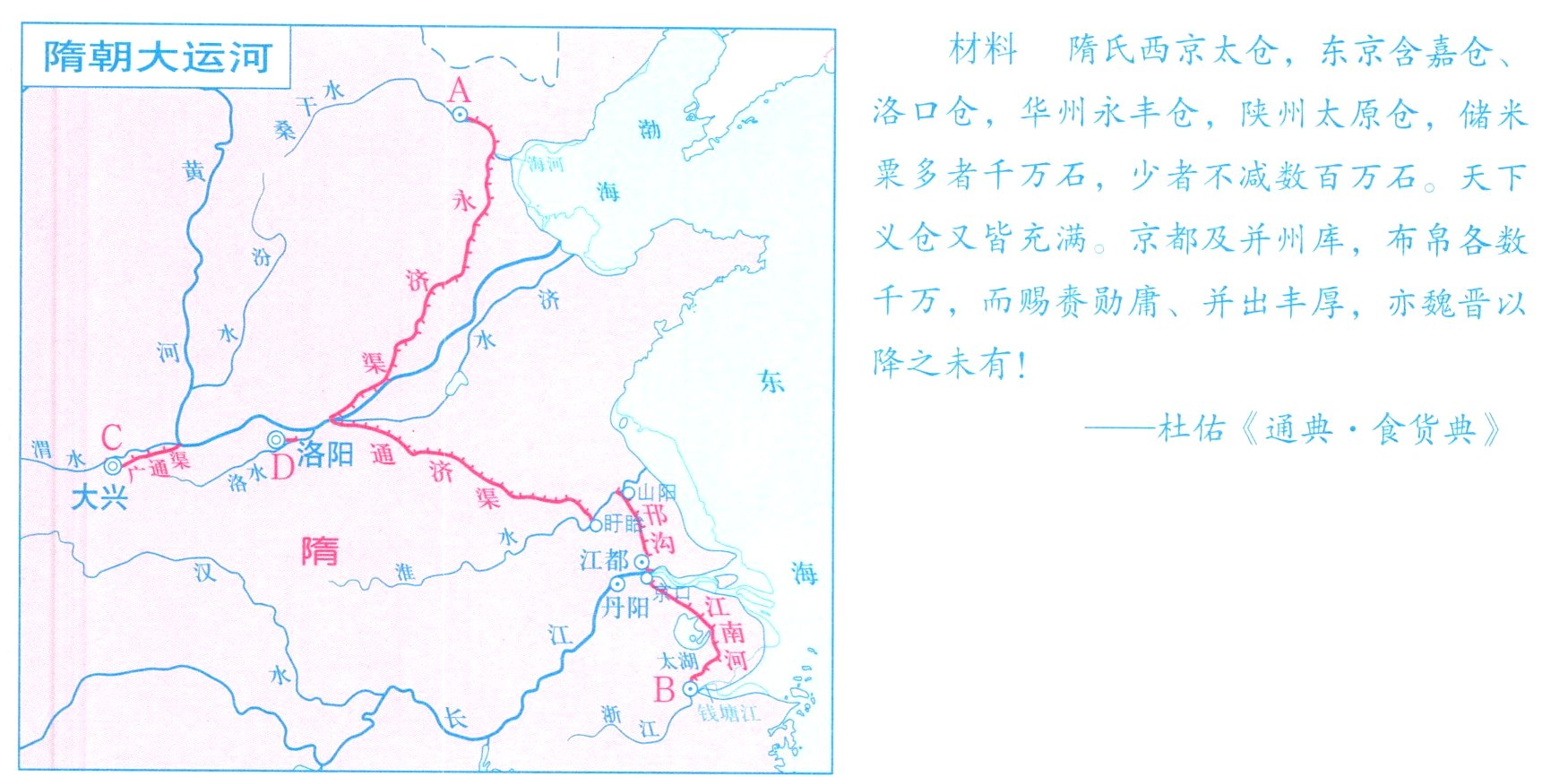 1. 写出图中隋朝大运河的南北至点A、B的城市名称,并写出C、D两处粮仓的名称。