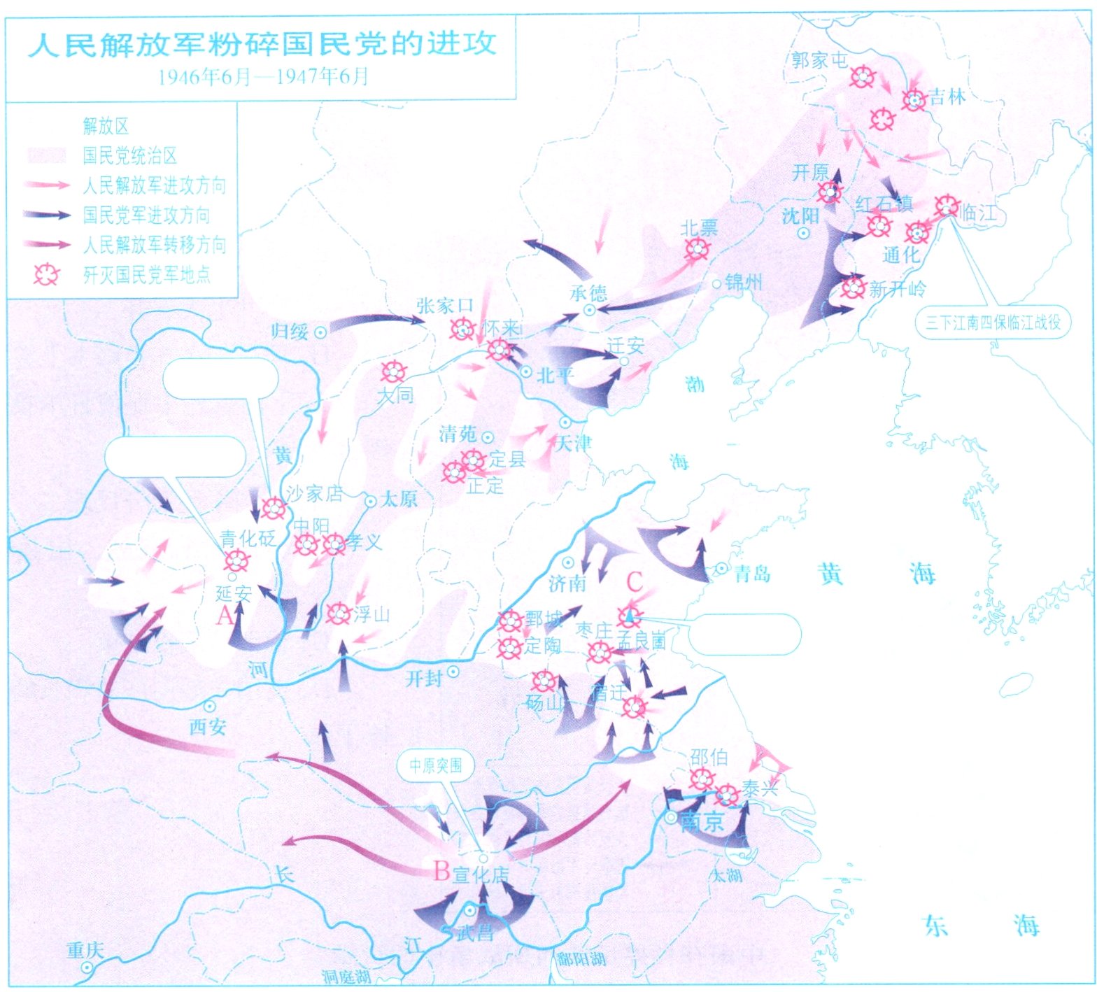 2. 在党中央的正确指挥下,人民解放军经过艰苦奋战,粉碎了国民党反动派的重点进攻。在图中 内填出粉碎重点进攻的战役。