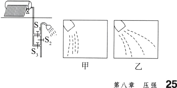 12.(生活物理)小梦、小明两家住在一栋楼的同一单元内,小梦家在3楼,小明家在顶层5楼。两家在本栋楼的楼顶屋面上的同一高度,装有如图所示的同一品牌、同一规格的太阳能热水器各一台,室内装有同种淋浴头(俗称喷头)。当他们将阀门S1打开到最大位置(S2、S3 关闭)时,淋浴头喷水情况如图甲、乙所示。图______(选填“甲”或“乙”)是小梦家的淋浴头喷水情况,判断的依据是____________________。