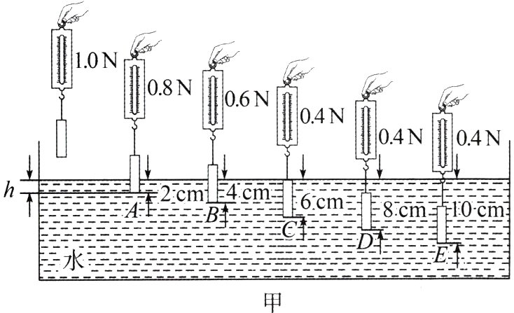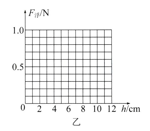 (2)如图甲所示,在弹簧测力计下悬挂一个高为6cm的长方体物块(可塑),测出物块所受的重力。将它缓慢浸入水中,记录悬停在A、B、C、D、E这五个位置时弹簧测力计的示数和深度h。请根据实验数据,在图乙中画出物块所受的浮力F浮随深度h变化的图像。