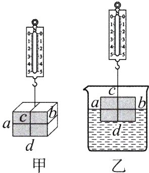 9. (科学探究)为了验证“浸在水中的物体所受浮力的大小跟物体浸入水中的深度无关”,选用如图所示的长方体(ab、cd为长方体中线标记线,ab>cd)、弹簧测力计和装有适量水的烧杯进行实验。