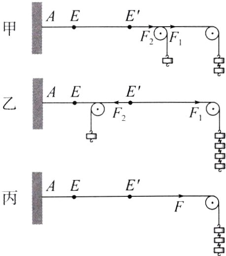 3. (教材素材变式)下图是“探究同一直线上二力的合成"的实验装置,图中AE表示橡皮筋原来的长度,EE'表示橡皮筋伸长的长度。(不计绳的质量,不计绳与滑轮的摩擦)