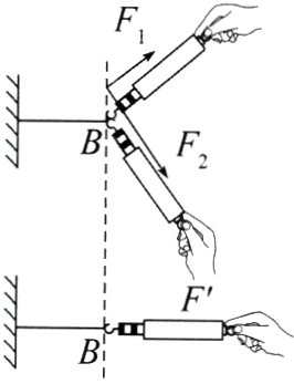 15. (2024.安徽合肥蜀山区期中)小华将一根橡皮筋的左端固定在墙上,用弹簧测力计拉其右端来探究两个分力与合力的关系。如图所示,他先将两弹簧测力计相互垂直作用在橡皮筋上拉到B点,记下两弹簧测力计的示数分别为F1 = 3.0N、F2 = 4.0N;然后只用一个弹簧测力计把该橡皮筋也拉到B点,读出弹簧测力计的示数F' = 5.0N。根据你对合力与分力的理解,判断F'______(选填“是”或“不是”)F1、F2的合力,你的判断理由是______________。