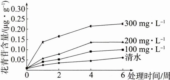 15.(探究实践)果皮色泽是评价果实品质的重要指标。葡萄果实的颜色是花青苷(细胞内的一种色素)在果皮中积累造成的。花青苷含量越高,葡萄果实颜色越深。某研究小组在葡萄果皮转色初期用不同浓度的脱落酸(一种抑制植物生长的植物激素)处理葡萄果穗,研究其对果实着色的影响,实验结果如图所示。请据图分析并回答以下问题:
