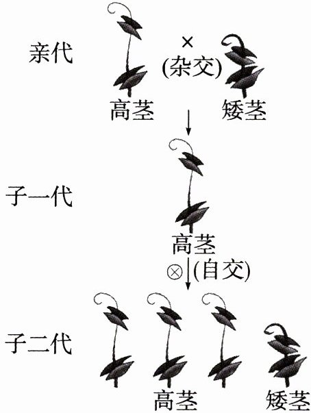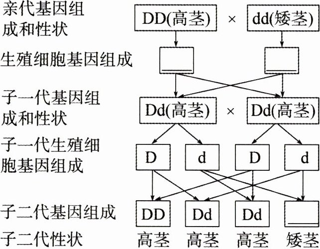 ①子一代(Dd)的生殖细胞分别含有________、________基因。如果子一代之间交配,携带不同基因的雌雄生殖细胞结合机会相等,子二代的基因组成有________、________、________三种,表现出的性状有高茎,也有矮茎。