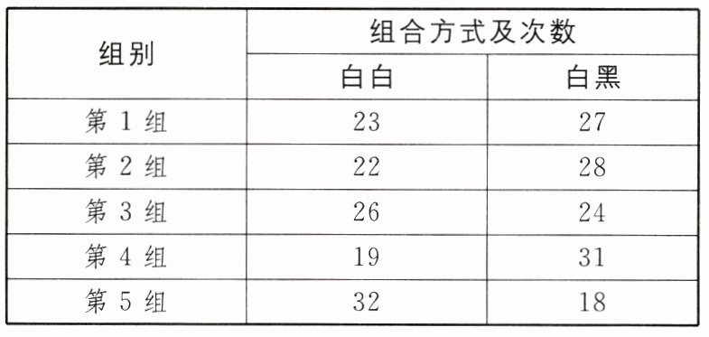 11. 人类的性别与性染色体有关,某生物兴趣小组利用棋子模拟人类的生殖细胞来探究生男生女的概率问题。探究方法如下:甲袋中装入 50 粒白色棋子,乙袋中装入黑、白棋子各 25 粒。每次从甲、乙两袋中分别随机摸出 1 粒棋子进行模拟组合。每个小组模拟组合 50 次。全班 5 个小组的实验结果如表所示: