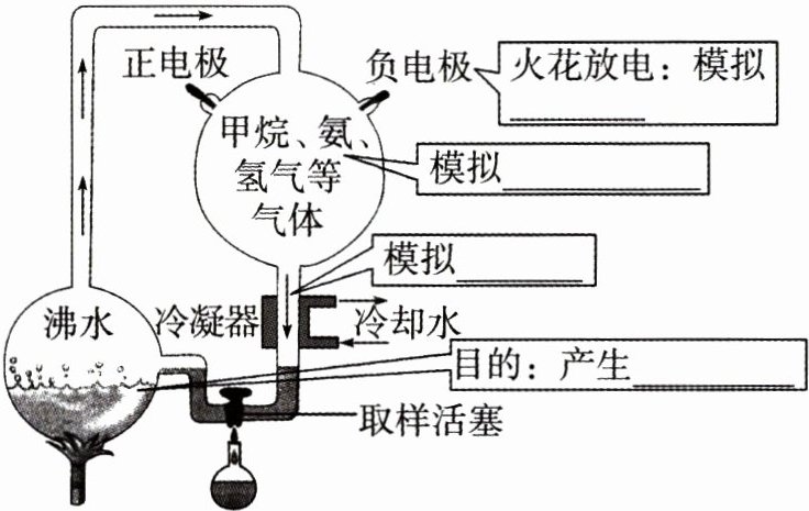 1. 米勒实验:美国学者米勒模拟原始地球的条件和大气成分,在实验室内合成了多种氨基酸。过程如[img id=1]所示: