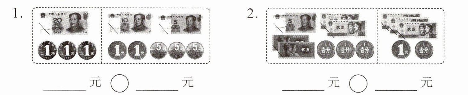 2. 比4元多5.3元是( )元;比7.4元少1.2元是( )元;( )元比5.2元少3.8元。