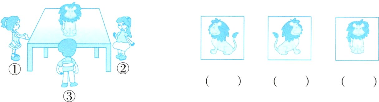 五、想一想,下面的三幅图分别是谁看到的?把他们的编号写在图片下面的括号里。