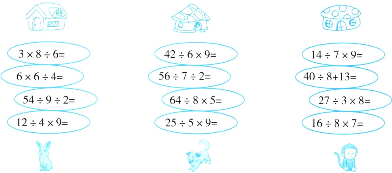 2. 5×9+3 4×7-2 5×6+19 56÷8×4 3×6+15