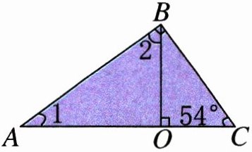 解析:先看三角形$ABC$,已知$\angle ABC = 90^{\circ}$,$\angle C = 54^{\circ}$,用$180^{\circ}$减去这两个角的度数,就是$\angle1$的度数。$180^{\circ}-90^{\circ}-54^{\circ}=36^{\circ}$。再看三角形$ABO$,已知$\angle AOB = 90^{\circ}$,用$180^{\circ}$分别减去$\angle AOB$和$\angle1$这两个角的度数,就是$\angle2$的度数,$180^{\circ}-90^{\circ}-36^{\circ}=54^{\circ}$。