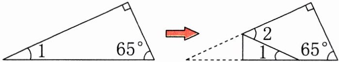 ∠2 = 180° - 70° - 70° = 40°@@∠1 = 90° - 65° = 25°