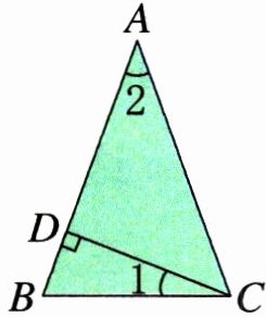 - (5)如图,在等腰三角形 $ABC$ 中,$AB = AC$,$\angle BDC = 90^{\circ}$,$\angle1 = 20^{\circ}$,求 $\angle2$ 的度数。