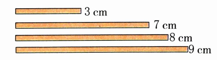 - (3)下面的每种小棒都有两根,任意取其中的三根,能摆出几种三角形?分别写出每种三角形三条边的长度。(任写五种)