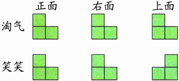4. 淘气和笑笑分别用4个小正方体搭了一个立体图形,从正面、右面和上面看到的形状如下。