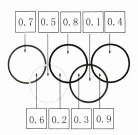 (2)奥运五环中,有 9 个空白处,将0.1,0.2,0.3……0.8,0.9 这 9 个小数填入空白处内,使每个圆圈中的数字之和等于 1.3。