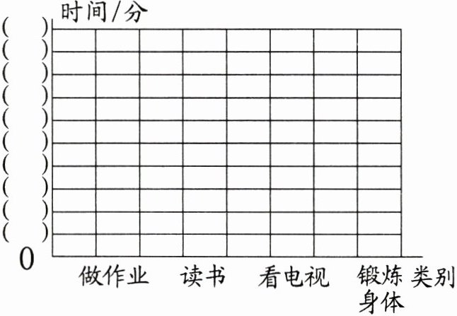 解析:观察统计图可知,图中每格代表几分没有给出,需要通过计算来确定每格代表几分。图中每列有10个格,观察统计表中的数据可知,看电视所用的时间最长,是180分,把180平均分成10份,求每份是多少,用除法计算,列式是180÷10 = 18,18接近整十数20,所以每格代表20分比较合适。先把统计图中纵轴代表的数据补充完整,然后再算出每种双休日活动分别要涂几个格,最后在格子里涂色表示出相应的数据。@@示例:平均每个学生看电视所用的时间最长,读书看报所用的时间最短;参加特长班所用的时间比锻炼身体所用的时间多85 - 74 = 11(分)。感想是适当地看电视,多看书读报。