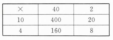 400 + 160 + 20 + 8 = 588 解析:先将两个乘数分别拆分为整十数和一位数,再将这4个数两两相乘,最后把乘得的4个积加起来,就得到两位数乘两位数的积。列表计算更加直观、清晰。