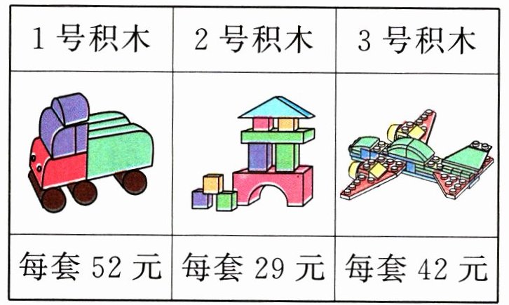 (8)王老师买了41套同样的积木(如下图),付给营业员1800元,还找回一些钱。他买的是( )号积木。王老师买积木实际花了( )元,找回( )元。