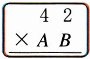 1596 解析:积个位上的数是6,2×3 = 6,2×8 = 16。代入验证:42×3 = 126,42×8 = 336,因此A = 3,B = 8,42×AB = 42×38 = 1596。或根据竖式计算列式:1260 + 336 = 1596。