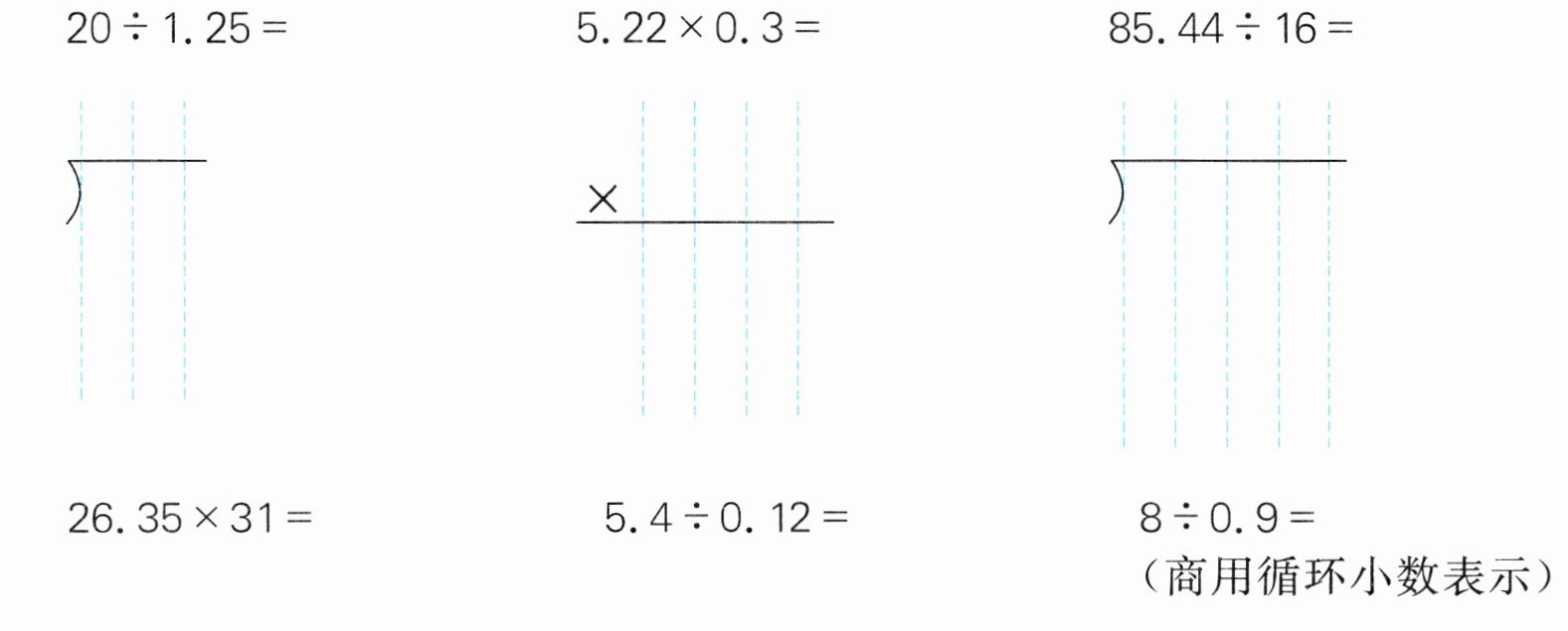 1.4×6 = 1.25÷0.5 = 2÷0.05 =