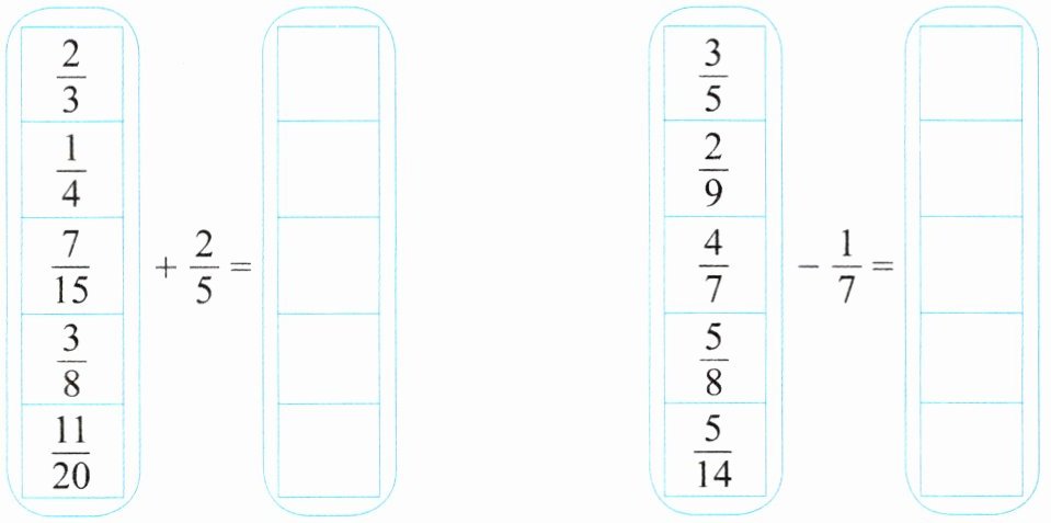 $\frac{1}{5}+\frac{3}{7}=$ $\frac{2}{3}+\frac{1}{6}=$ $\frac{2}{3}-\frac{1}{4}=$ $\frac{1}{3}-\frac{1}{4}=$
