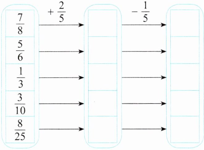 $\frac{2}{15}+\frac{1}{5}=$ $1-\frac{4}{9}=$ $\frac{7}{6}+\frac{2}{3}=$ $\frac{7}{10}-\frac{1}{5}=$