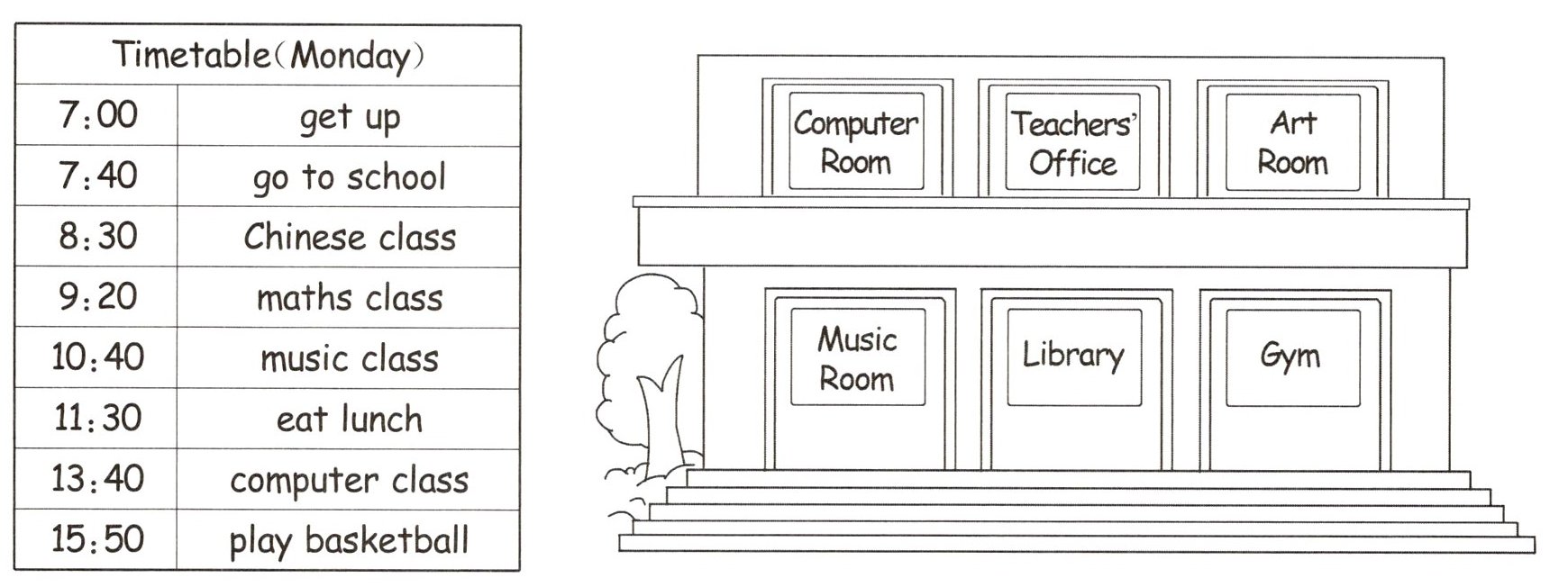 五、Lucy 正在介绍她周一的作息情况。根据作息表与图片信息,选择合适的选项。