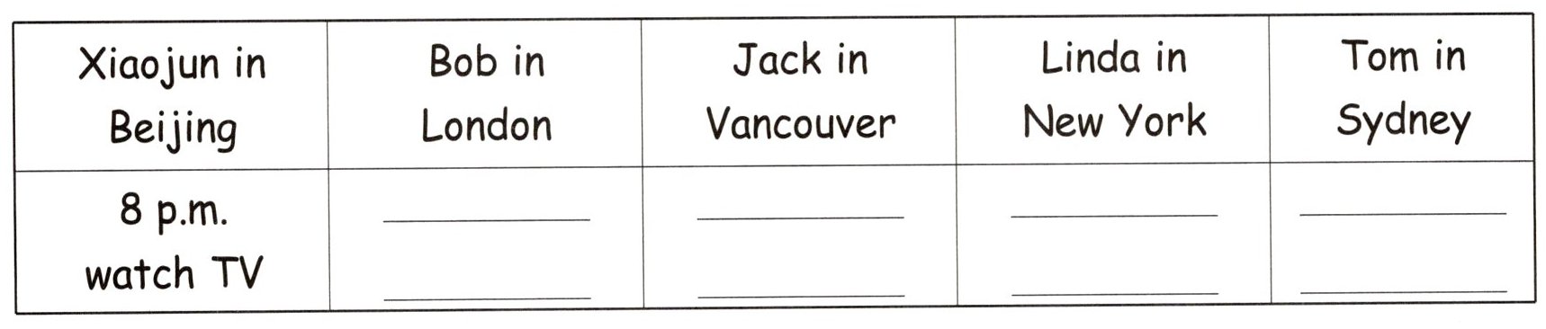 六、时区的差异导致世界不同地方时间的差异。请阅读下面的材料,补充表格所缺的内容。