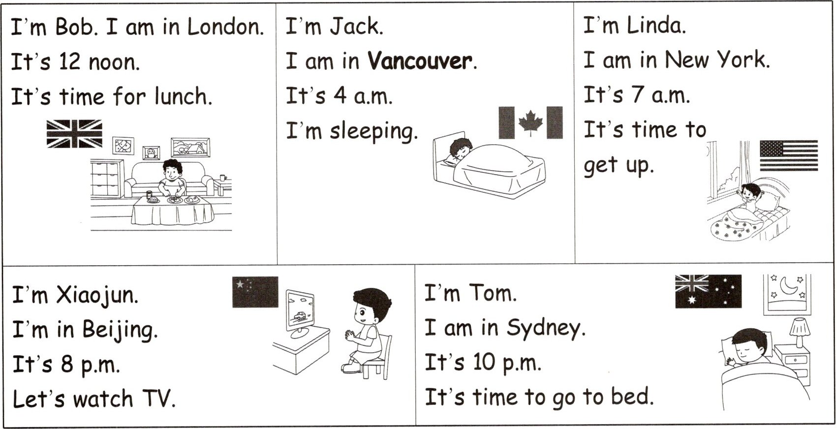 It's 8 p.m. in Beijing. What time is it in other cities? What are the children doing?