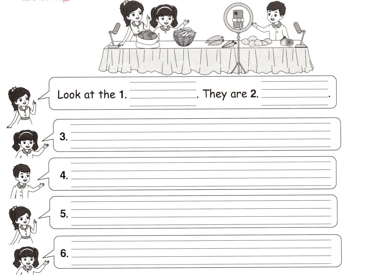 五、情境题 助农直播。农场里有很多蔬菜,一些志愿者正在通过直播平台帮助农民销售蔬菜。请你仿照例子,把他们的话补充完整。例:Look at the apples. They are so big.